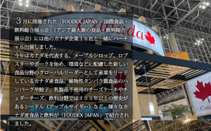 3月に開催された「FOODEX JAPAN/国際食品・飲料総合展示会」(アジア最大級の食品・飲料総合展示会)には他のカナダ企業16社と一緒にバーチャル出展しました。